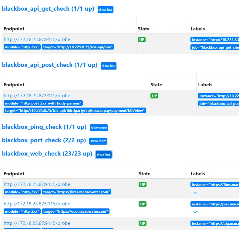 - job_name: 'blackbox_web_check' # web站点检测 scrape_interval: 10s metrics_path: /probe file_sd_configs: - files: - /opt/prometheus/latest/targets/blackbox-web-check.yml refresh_interval: 5s params: module: [http_2xx] relabel_configs: - source_labels: [__address__] target_label: __param_target - source_labels: [__param_target] target_label: instance - target_label: __address__ replacement: 172.18.25.87:9115 # blackbox-exporter 服务所在的机器和端口 - job_name: 'blackbox_api_get_check' # 接口返回内容检测 scrape_interval: 10s metrics_path: /probe file_sd_configs: - files: - /opt/prometheus/latest/targets/blackbox-api-get-check.yml refresh_interval: 5s params: module: [http_2xx] relabel_configs: - source_labels: [__address__] target_label: __param_target - source_labels: [__param_target] target_label: instance - target_label: __address__ replacement: 172.18.25.87:9115 # blackbox-exporter 服务所在的机器和端口 - job_name: 'blackbox_api_post_check' # 接口返回内容检测 scrape_interval: 10s metrics_path: /probe file_sd_configs: - files: - /opt/prometheus/latest/targets/blackbox-api-post-check.yml refresh_interval: 5s params: module: [http_post_2xx_with_body_params] relabel_configs: - source_labels: [__address__] target_label: __param_target - source_labels: [__param_target] target_label: instance - target_label: __address__ replacement: 172.18.25.87:9115 # blackbox-exporter 服务所在的机器和端口 - job_name: 'blackbox_port_check' # 端口检测 scrape_interval: 10s metrics_path: /probe file_sd_configs: - files: - /opt/prometheus/latest/targets/blackbox-port-check.yml refresh_interval: 5s params: module: [tcp_connect] relabel_configs: - source_labels: [__address__] target_label: __param_target - source_labels: [__param_target] target_label: instance - target_label: __address__ replacement: 172.18.25.87:9115 # blackbox-exporter 服务所在的机器和端口 - job_name: 'blackbox_ping_check' # 检测是否可以ping通某些机器 scrape_interval: 10s metrics_path: /probe file_sd_configs: - files: - /opt/prometheus/latest/targets/blackbox-ping-check.yml refresh_interval: 5s params: module: [icmp] relabel_configs: - source_labels: [__address__] target_label: __param_target - source_labels: [__param_target] target_label: instance - target_label: __address__ replacement: 172.18.25.87:9115 # blackbox-exporter 服务所在的机器和端口