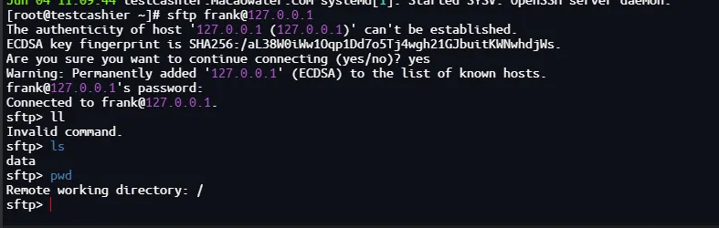 2、执行以下命令,创建用户"frank",并指定用户所属组为"sftpusers"