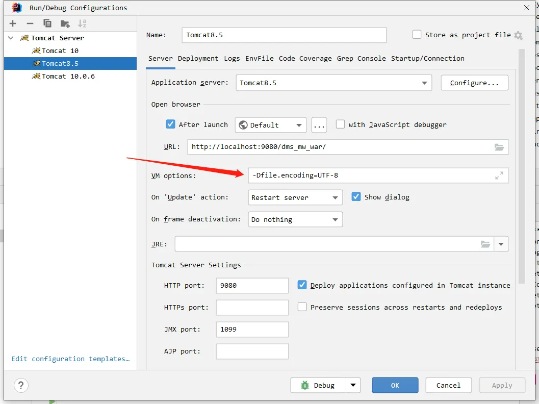 上方导航栏Run→Edit Configurations…进入配置页面,修改当前 Web 项目 Tomcat Server 的虚拟机输出选项 VM options 添加 -Dfile.encoding=UTF-8 。在重启之后运行程序检查控制台信息,如果不管用请执行下面的步骤。